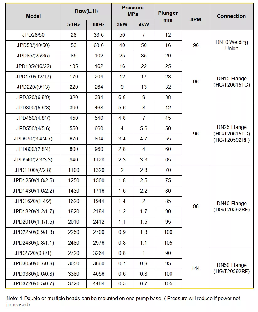 JPD serisi pistonlu/pistonlu dozaj pompası büyük akış ve yüksek basınçlı dozajlama için tasarlanmıştır. Maksimum basınç 50Mpa’ya kadar çıkabilir. Sıvı ucu SS316 pistondan kaplanmış seramiktir. Pistonlu paketleme contası, yüksek basınç sağlamak ve minimum sızıntı ile uzun ömür sağlamak için SS316 conta halkası ile sıkıştırılmış PTFE’dir. JPD motoru hem dikey hem de yatay olarak monte edilebilir. Bir motor tahriki ve pompa tabanına sahip çoklu dişli kutuları mevcuttur.