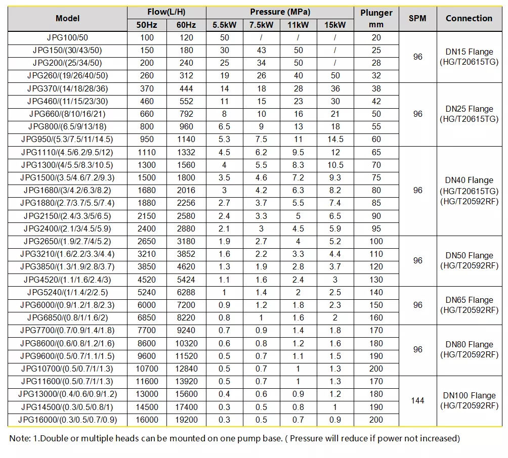 JPG serisi pistonlu dozaj pompası, yüksek performansla akış ve yüksek basınç dozajı için tasarlanmıştır. Maksimum basınç 500 bara kadar çıkabilir. Sıvı ucu SS316 pistondan kaplanmış seramiktir. Pistonlu salmastra contası, yüksek basınç sağlamak ve minimum sızıntı ile uzun ömür sağlamak için SS316 conta halkası ile sıkıştırılmış PTFE’dir. JPT pompası, enerji santrali, petrol, kimya endüstrisi, madencilik, gemi yapımı, hafif endüstri vb. alanlarda yaygın olarak kullanılır.